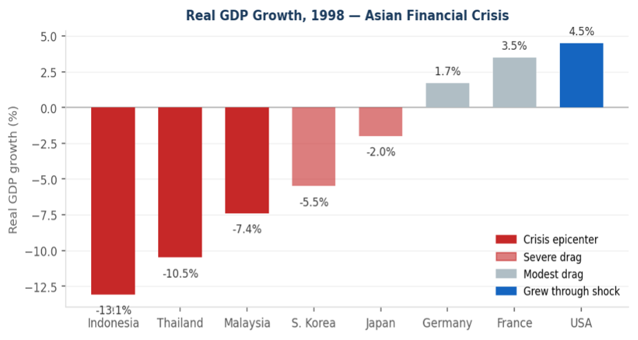 Figure 1. Real GDP growth, 1998. US grew 4.5% while crisis epicenters contracted 7–13%. Source: World Bank / IMF.