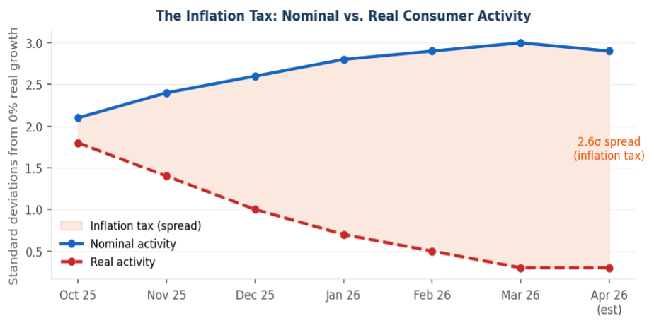 Figure 3. Nominal vs. real consumer activity indices, Oct 2025 – Apr 2026 (est). The 2.6σ spread is the inflation tax: households spending more nominal dollars for less real consumption. Underlying Data Source: Employ America.