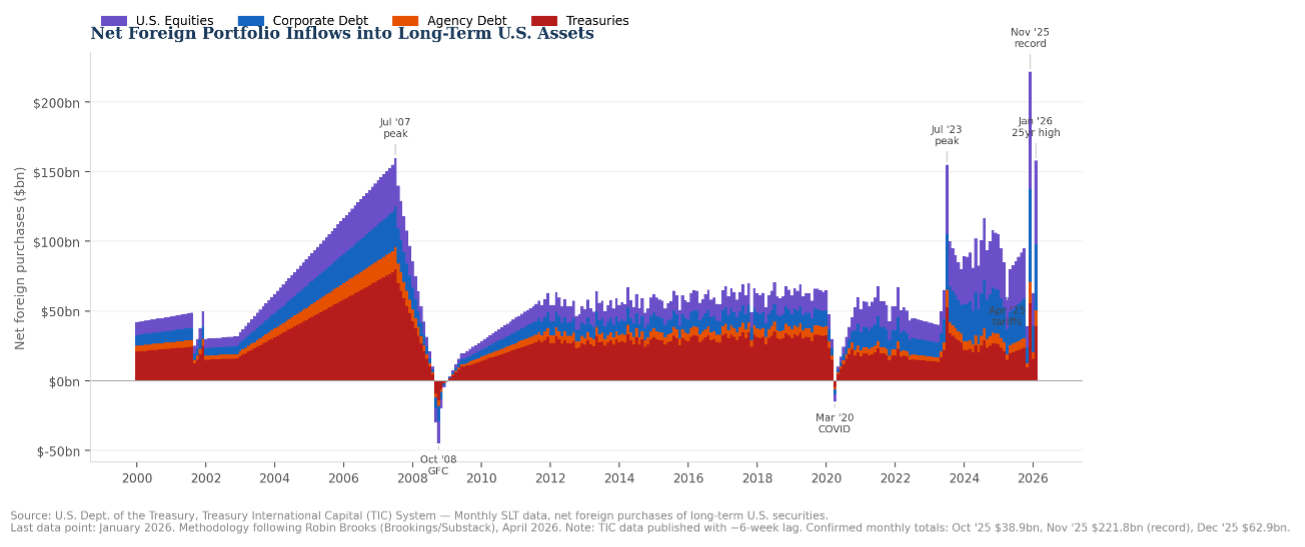 Foreign portfolio inflows into US Treasuries, corporate debt, and equities were at their strongest levels in over twenty-five years as of January 2026, and the conflict has reinforced rather than reversed that dynamic. The narrative of a Sell America trade has no basis in the flow data.