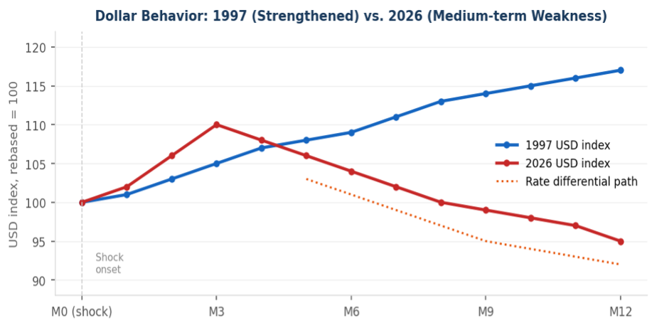 The 1997 episode produced a textbook safe-haven dollar surge. In 2026, the initial phase of the Hormuz shock has produced a similar temporary pattern — risk aversion supporting the dollar as the conflict broke.