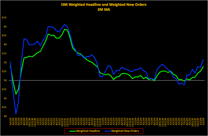New Orders Surge: This is the breakout. The forward-looking new orders component for services improved to a robust 58.6. The economically weighted three-month average (including manufacturing) hit 55.18 - the highest level in over three years.