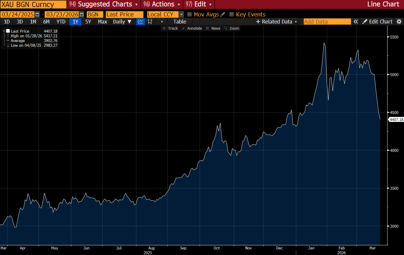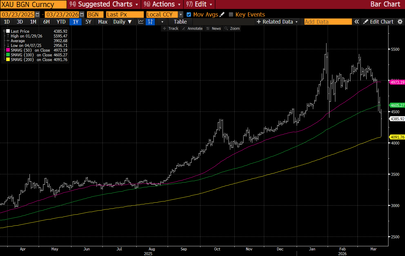 The gold market peaked before the war. Markets always look forward and priced in the dollar pop resulting from a geopolitical risk-off. Buy the rumor sell the fact.