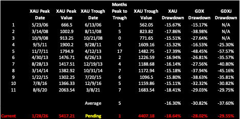 Below is an updated table from a October 20, 2025 note showing post-2006 drawdowns. In addition, the corresponding drawdowns are shown for the two dominant gold miner ETFs, GDX and GDXJ.