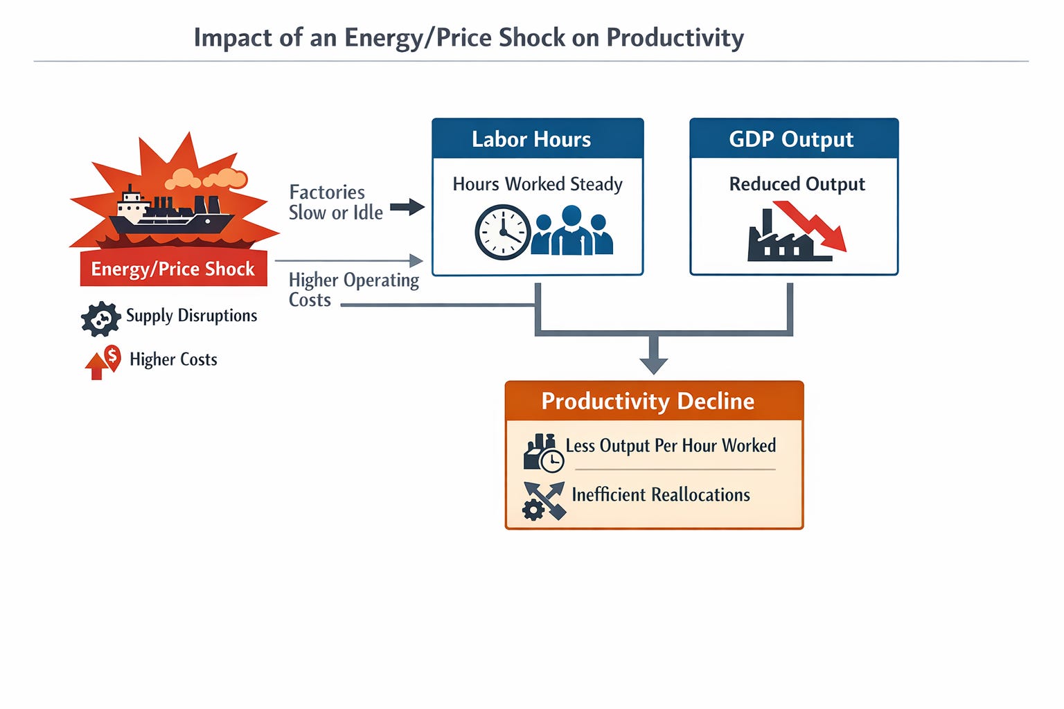 Production becomes constrained. Energy shocks, commodity shortages, or logistics disruptions mean factories are idle, production schedules break, and inventories fall. Workers can remain employed, but they produce less output per hour.