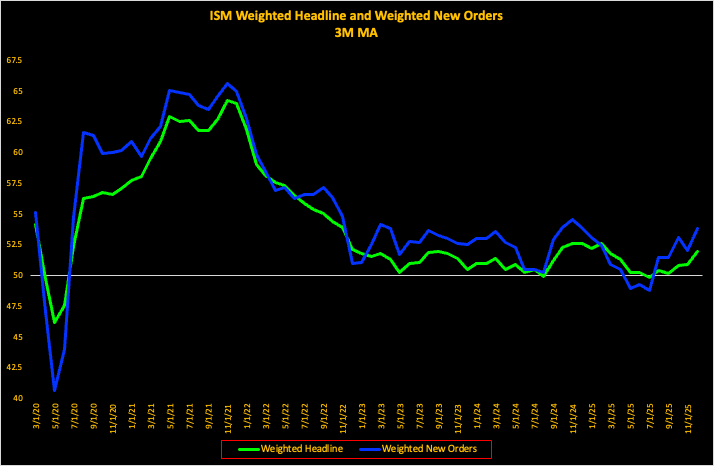 Even with a lagging manufacturing base, the weighted averages of both headline and the forward-looking new orders subcomponent of both manufacturing and new orders point to a very clear expansion of the economy.