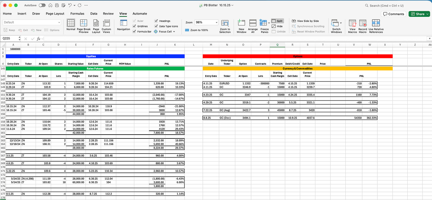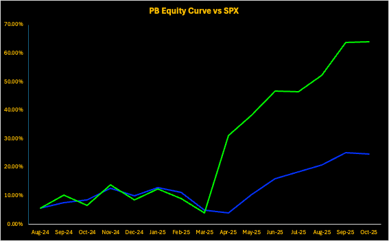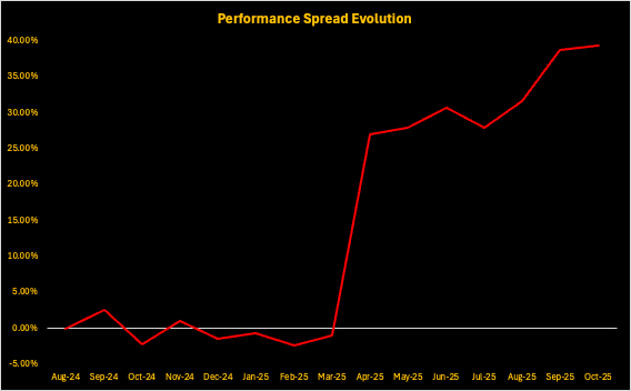Here are the monthly performance numbers, from inception August 5, 2024, through close of trading on October 15, 2025.