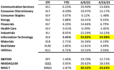 The table showed that despite having an awful first quarter, U.S. large cap tech outperformed during the month of April and showed the strongest sectoral outperformance since the end of Q1.