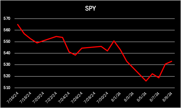 Allowing for terrible executions and delays on a volatile day, assuming SPY was purchased around 10:30am that day at 516-ish, the price return on that trade as of Friday’s close (August 9th) would be 3.29%