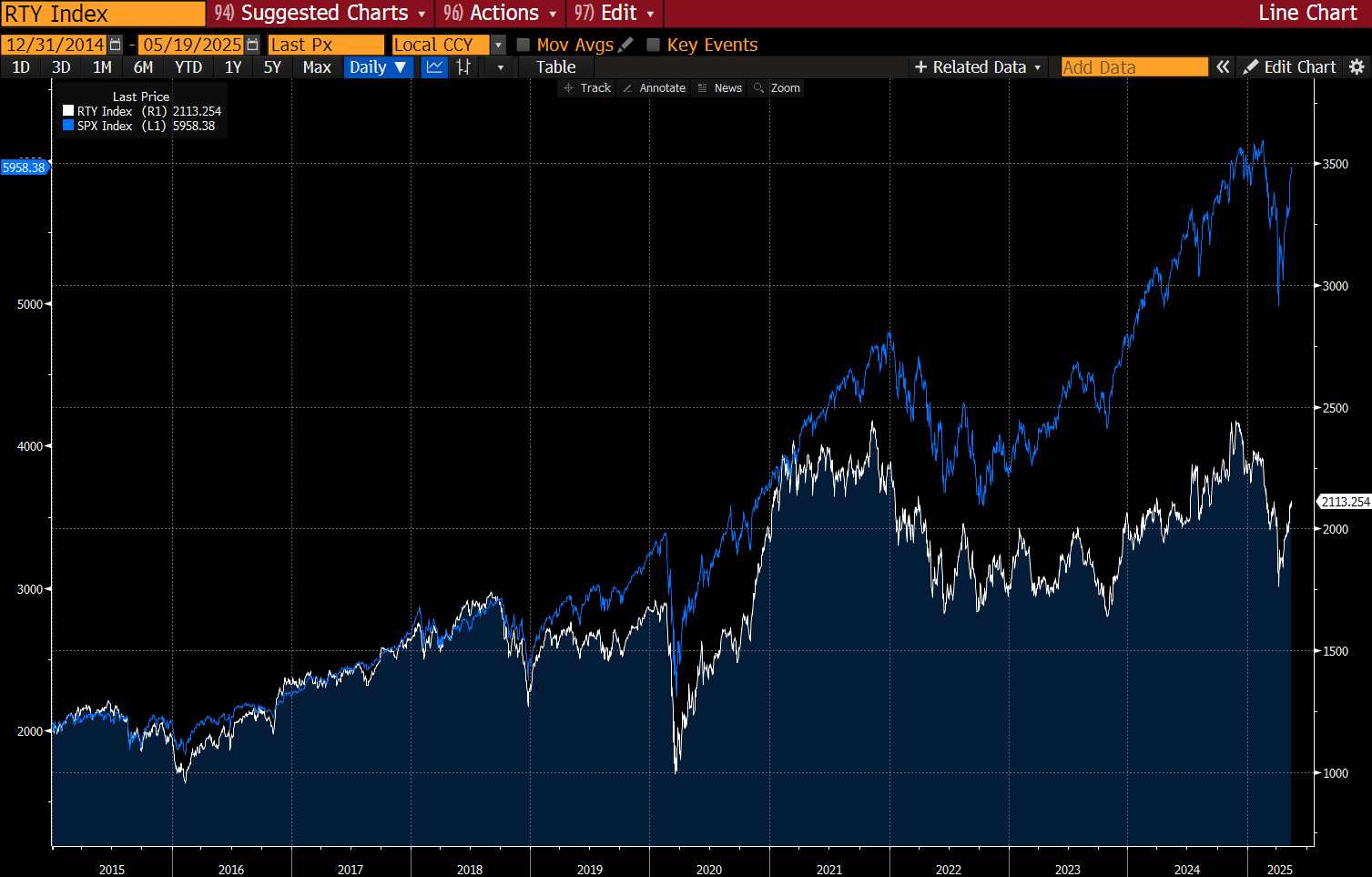 The S&P500 is finally near break-even YTD, Moody’s sovereign downgrade of U.S. Treasury’s notwithstanding. The Russell 2,000 (“R2K”) is lagging, down 8.82% YTD. With the economic cycle seemingly saved from the jaws of defeat, is now a good time to bet on a mean-reversion catch up trade?