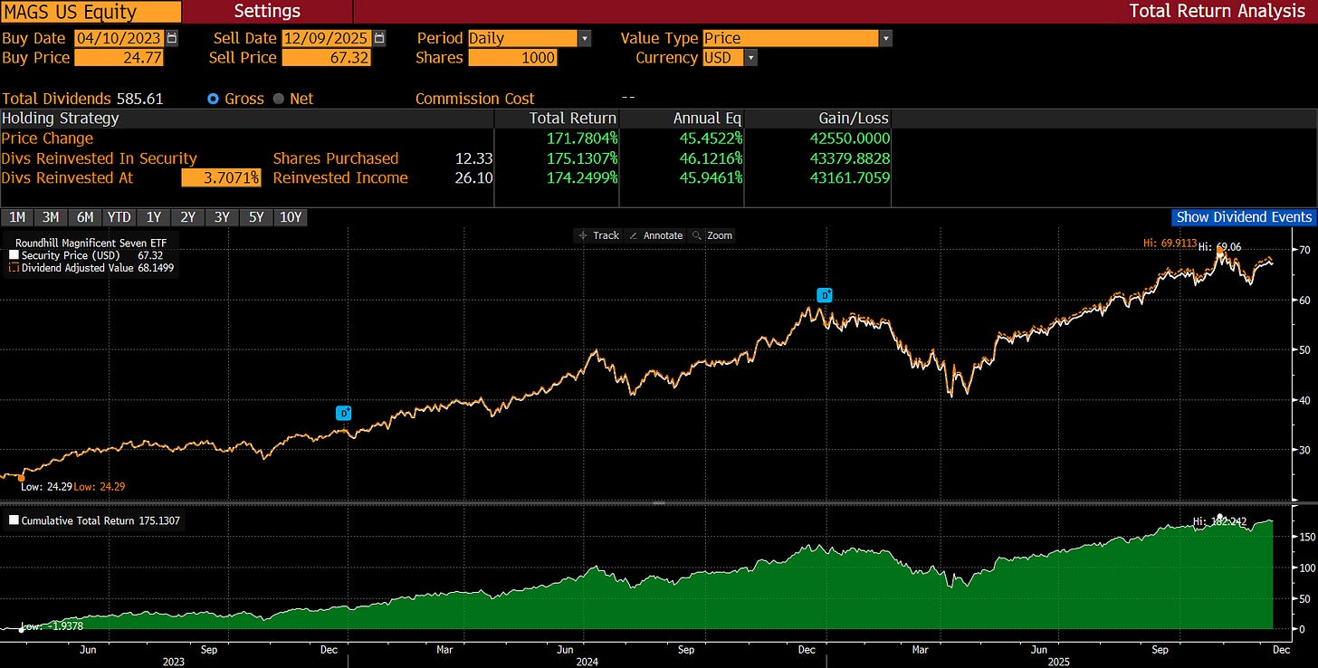 The MAGS ETF, which offers equal weight exposure to the Mag-7 stocks, has delivered a 175.13% total return since inception on April 10, 2023. This is a 46.12% compounded annual growth rate (CAGR).
