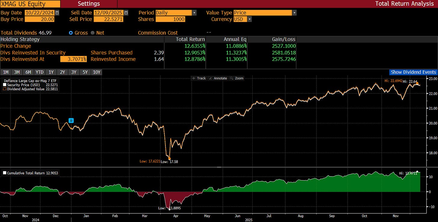 The XMAG ETF, which provides exposure to the S&P500, excluding the MAG-7 has been a significant underperformer. While it has a shorter history than MAGS, the CAGR since inception on October 21, 2024, is a sad 11.32%.