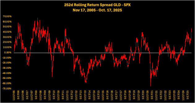 On Thursday, October 16, 2025, GLD, the gold ETF, closed within a hair of being overbought by 2-standard deviations relative to the S&P500 on a one-calendar year lookback window.