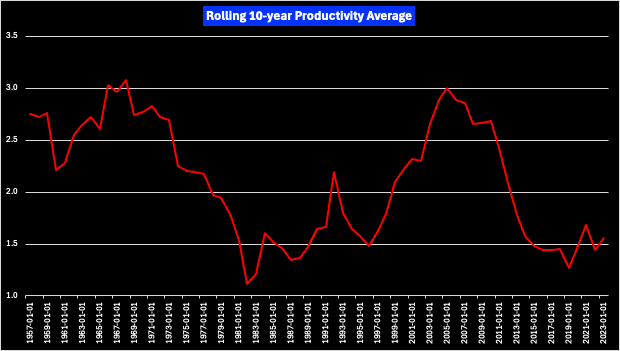 As noted previously, U.S. long run productivity growth has averaged 2.1% since 1948. That number fell to 1.3% in the decade after the global financial crisis.
