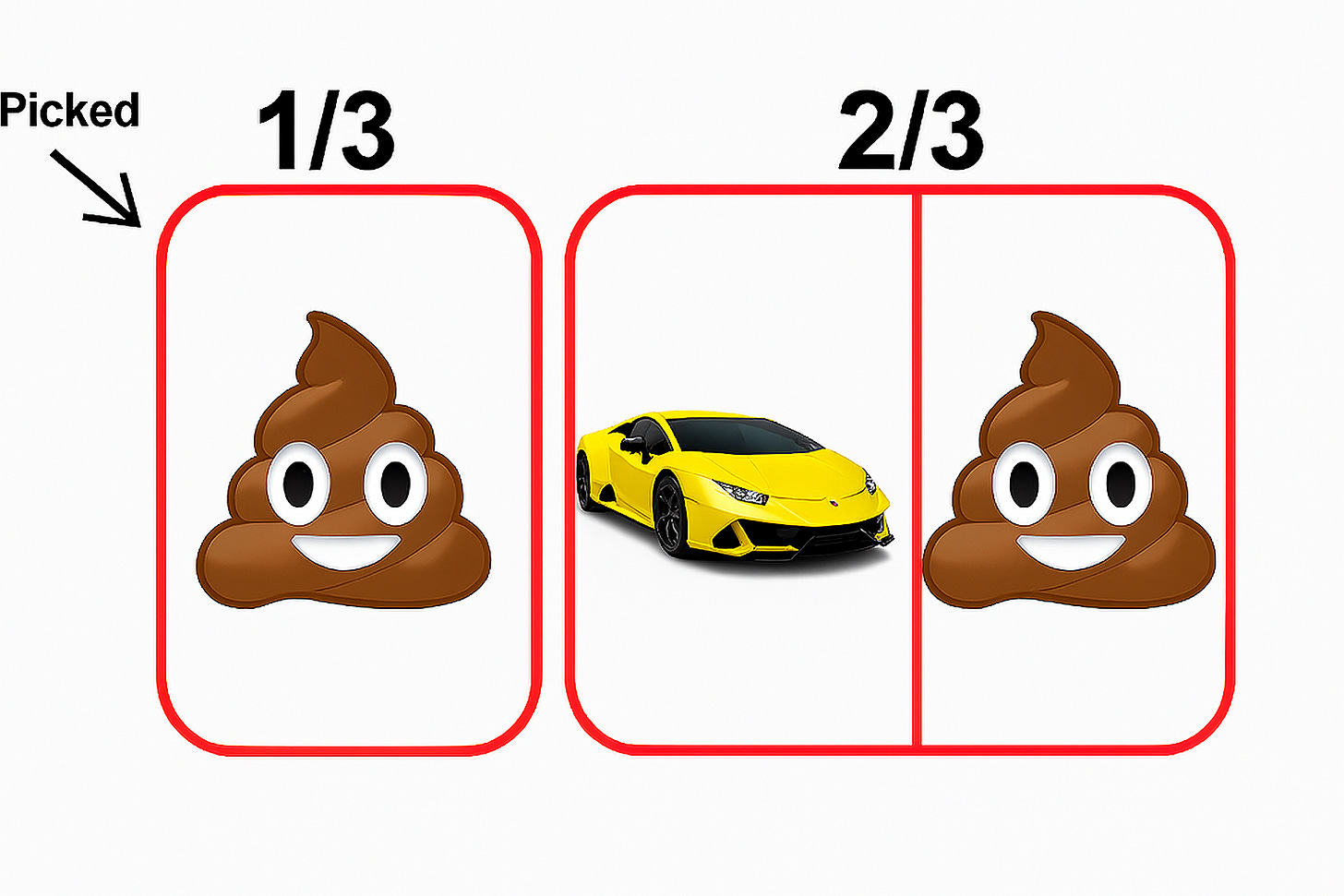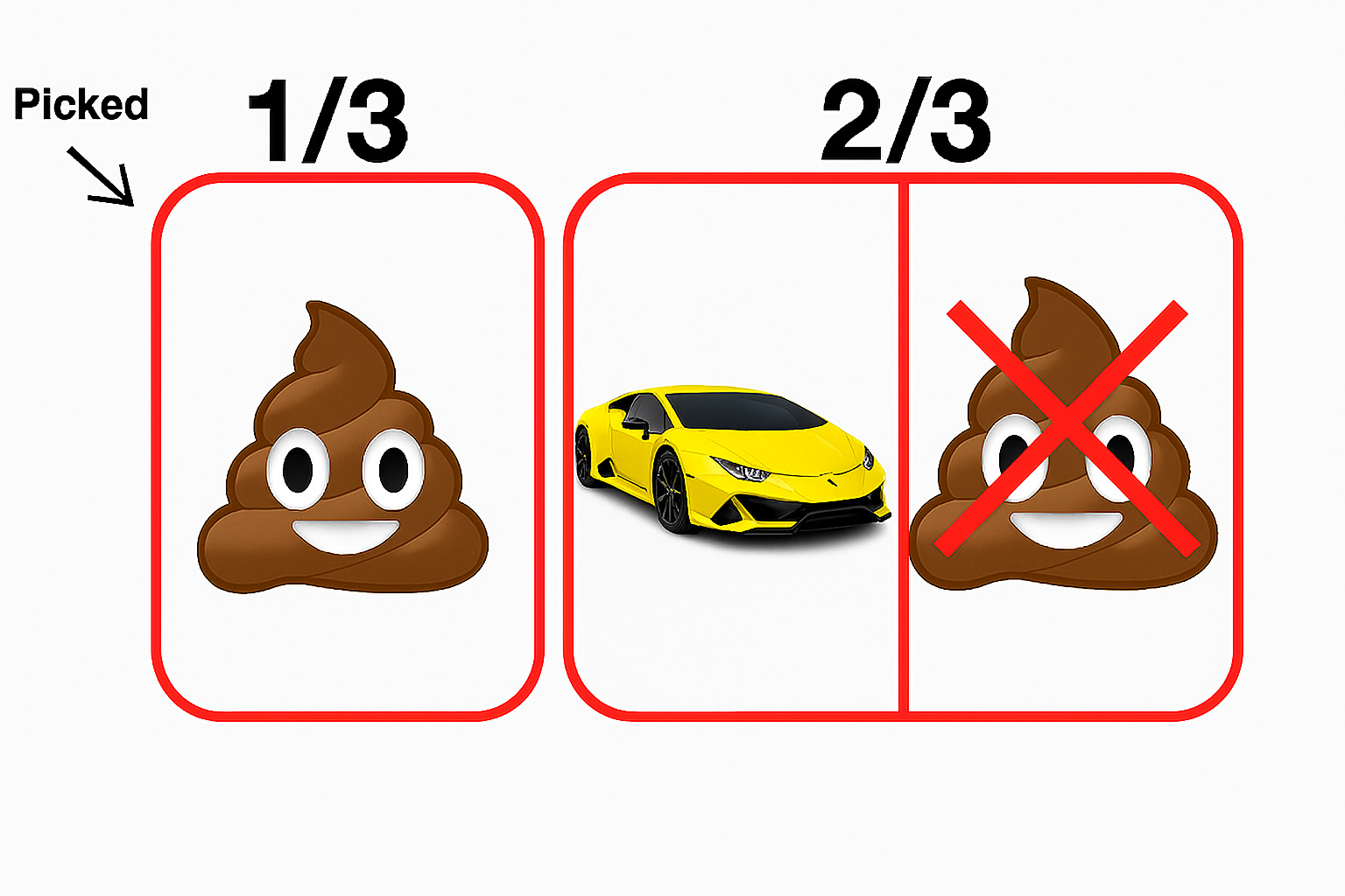 Meanwhile, the game show host – who has perfect information - opens door three and reveals a turd.