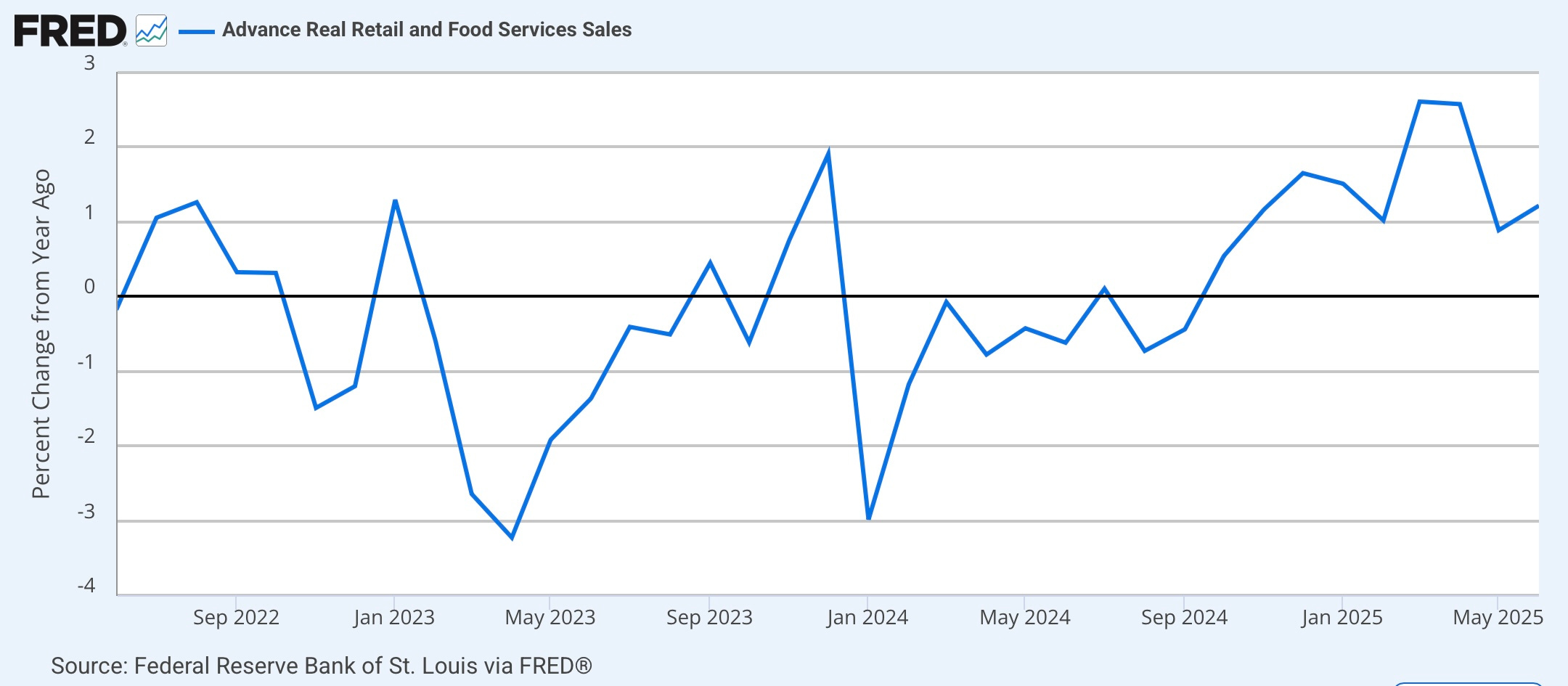 In June, retail sales rose by .6% MoM, while CPI came in at .3% MoM. Thus, real retail sales increased by .3% MoM.
