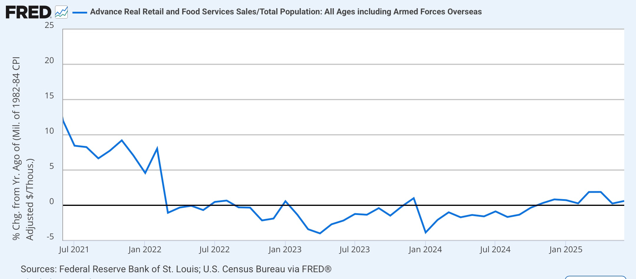 Digging below the surface and adjusting for changes in population growth (immigration?), real retail sales are still .6% higher YoY, which suggests no recession over the next few quarters.