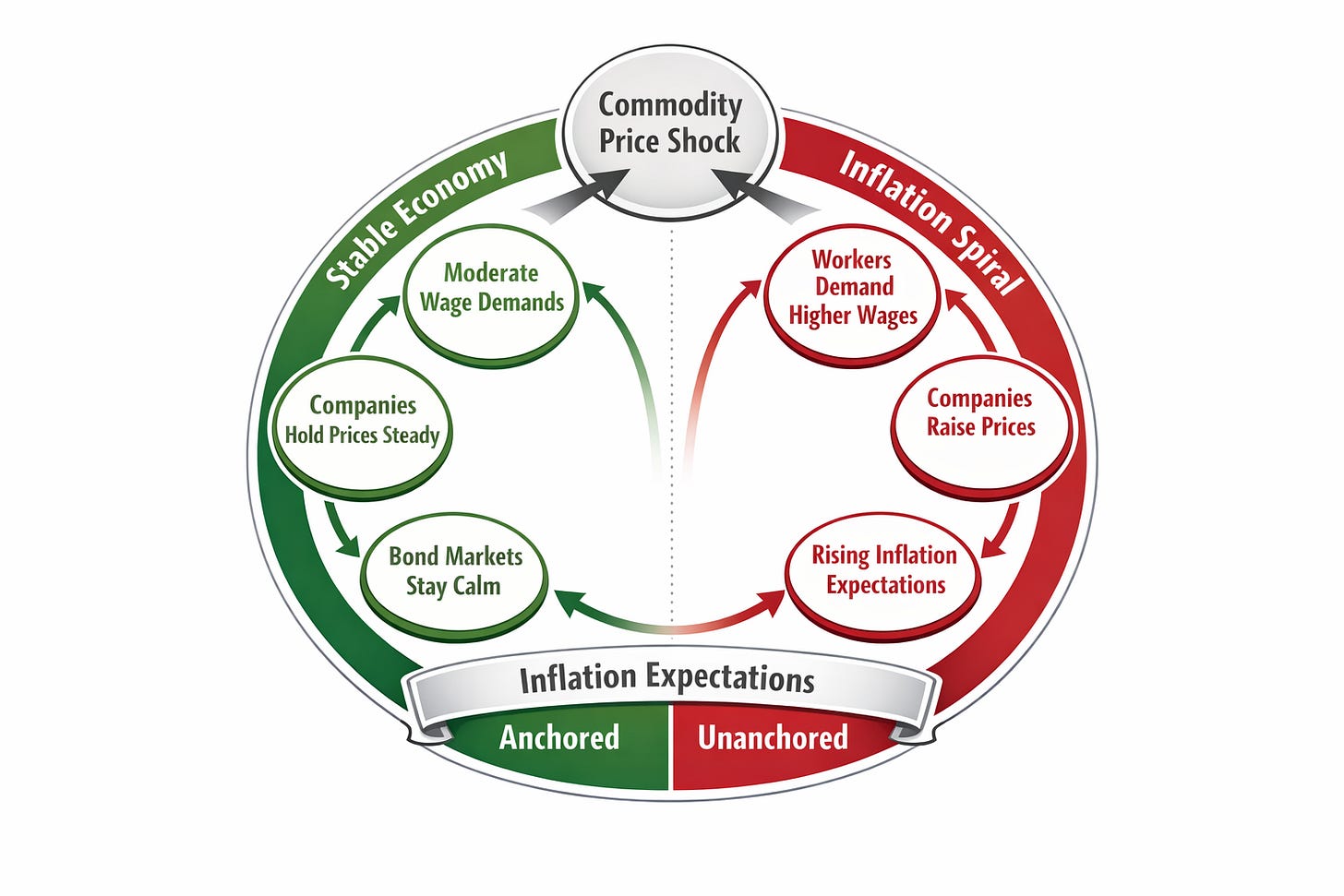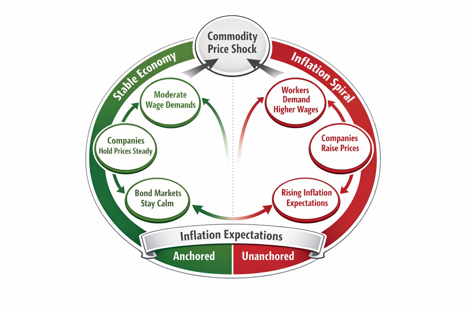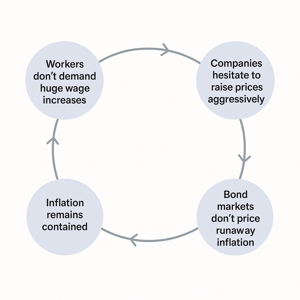 The Fed’s credibility is the real anchor. After the inflation collapse in the early 1980s, markets bet that if inflation went up, the Fed would crush it. That belief changed behavior everywhere, with a recursive positive feedback loop that looks like this.