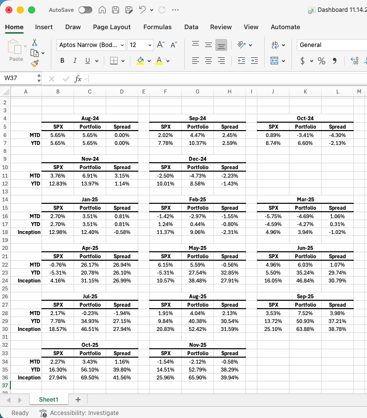 The blotter dashboard, which summarizes monthly performance since inception, will be updated at the end of each month.
