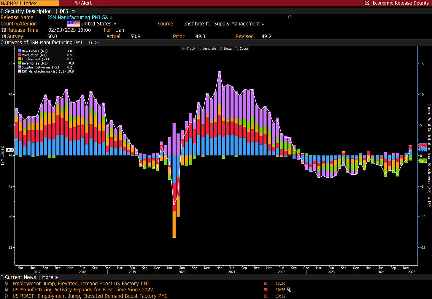 On Monday, the ISM manufacturing index came in above expectations, printing at 50.9. This was the first print above 50 since October 2022. Recall this is a diffusion index, where a number below 50 indicates contraction of the sector, and a number above 50 indicate expansion. The more leading new orders subindex rose 3 points to 55.1.