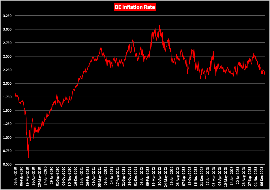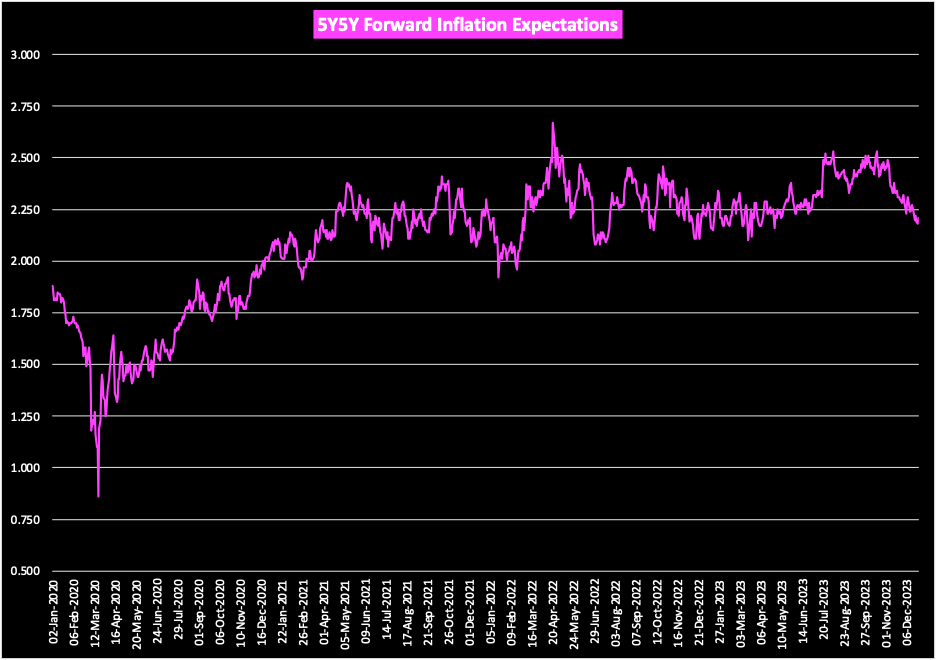 Break-evens and 5y5y forward inflation expectations both peaked in April of 2022.
